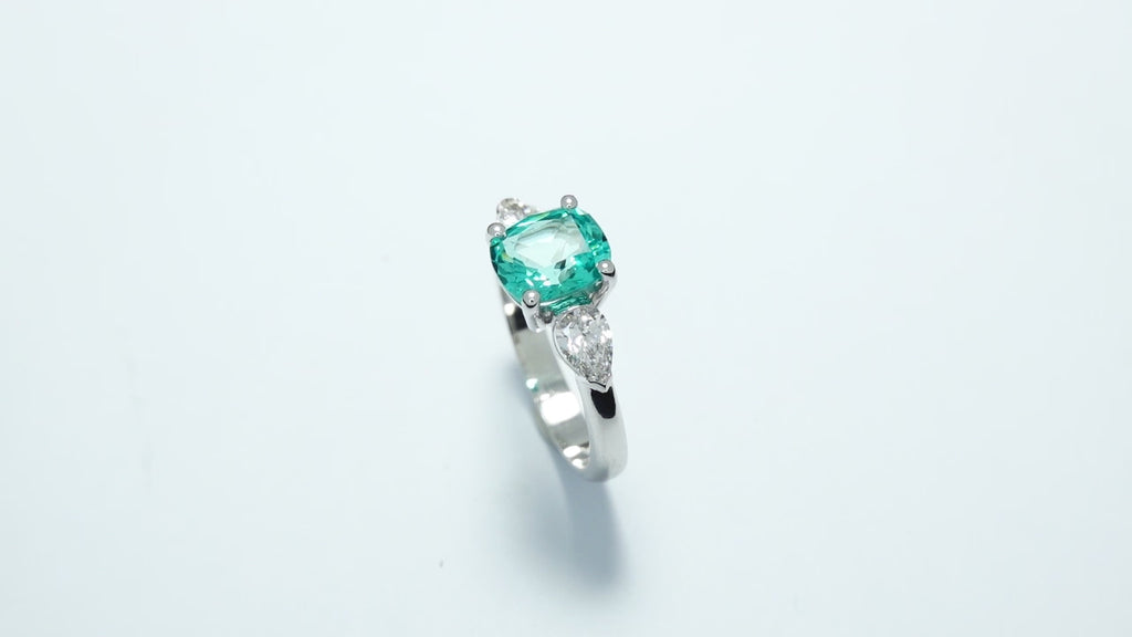 Bague or blanc sertie d'un chrysobéryl de laboratoire et de diamants taille poire certifiés.